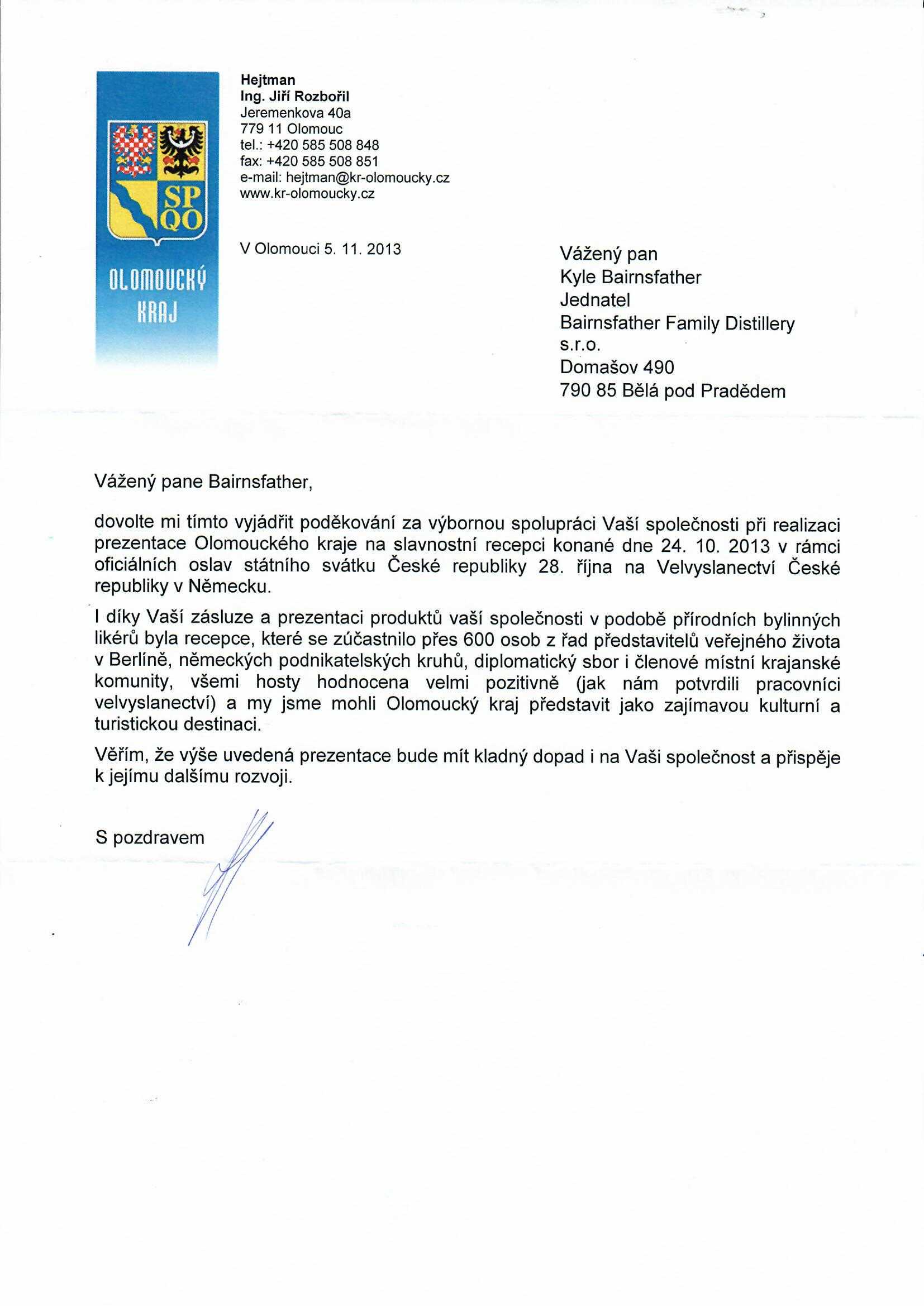 Poděkování od pana Hejtmana za reprezentaci na Velvyslanectví