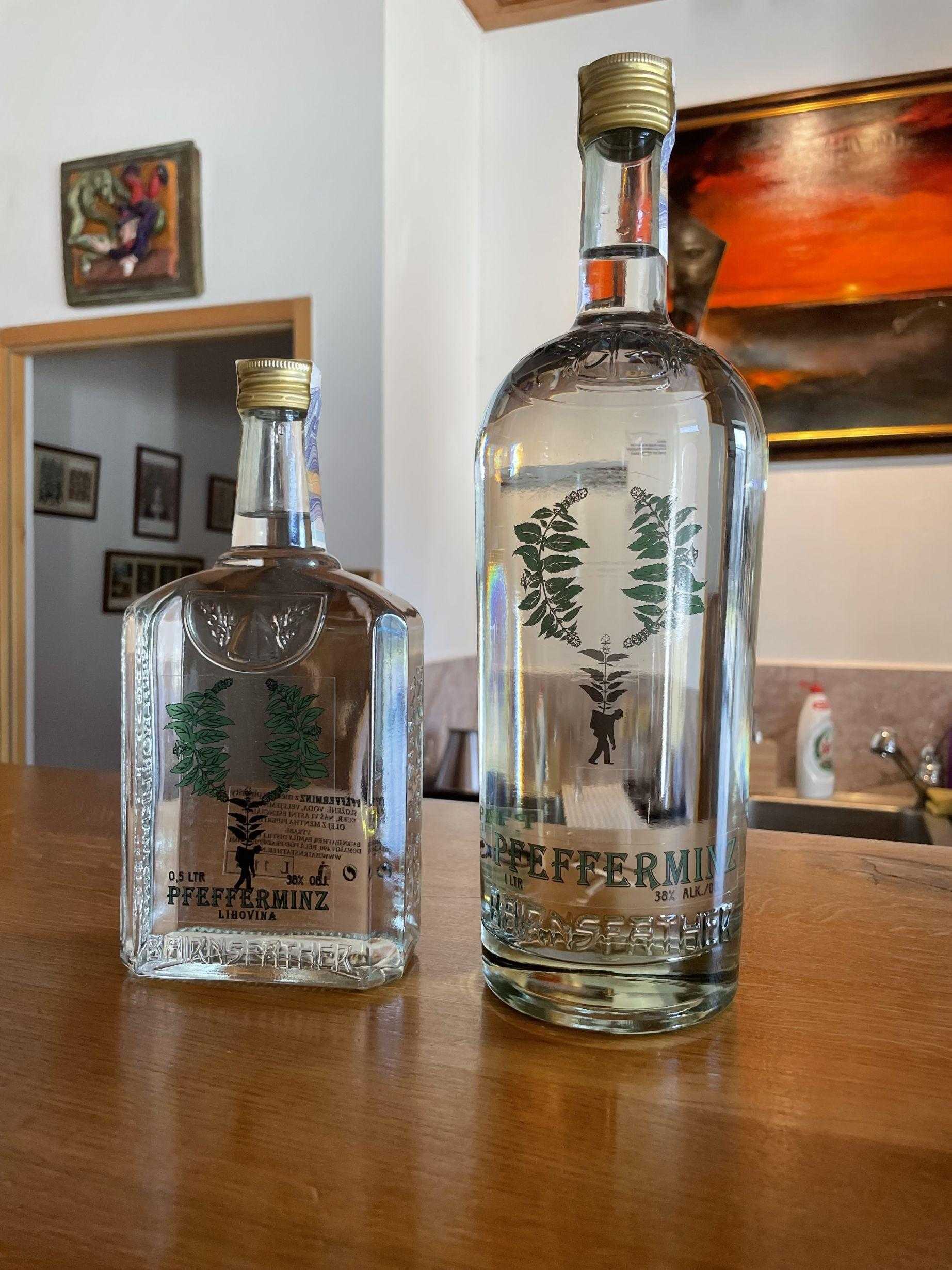 Pfefferminz 38%Pfefferminz je krystalově čistá, čirá lihovina, která obsahuje pouze velejemný líh, neupravenou kojeneckou vodu, cukr a naše vlastní esence z máty peprné. Esenci vyrábíme sami ze speciálního druhu máty peprné, kterou sklízíme a zpracováváme sami. Výsledkem je mimořádně čistý alkoholický nápoj s velmi bohatým přírodním obsahem, získaného díky velké a pečlivé práci na poli a v likérce. Výrobek je vyráběn v lahvích o objemu 1L a 0,5L. | |